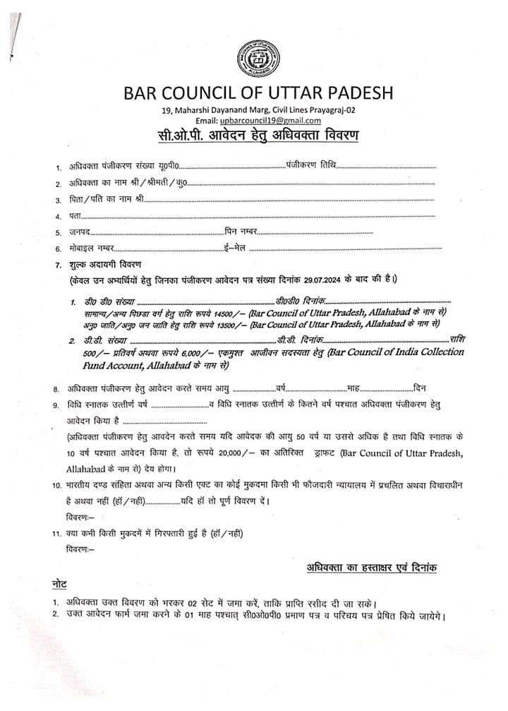 Communication Address: THE BAR COUNCIL OF UTTAR PRADESH 19, Maharshi Dayanand Marg, Civil Lines, ALLAHABAD 211001 email: barcouncilup@gmail.com